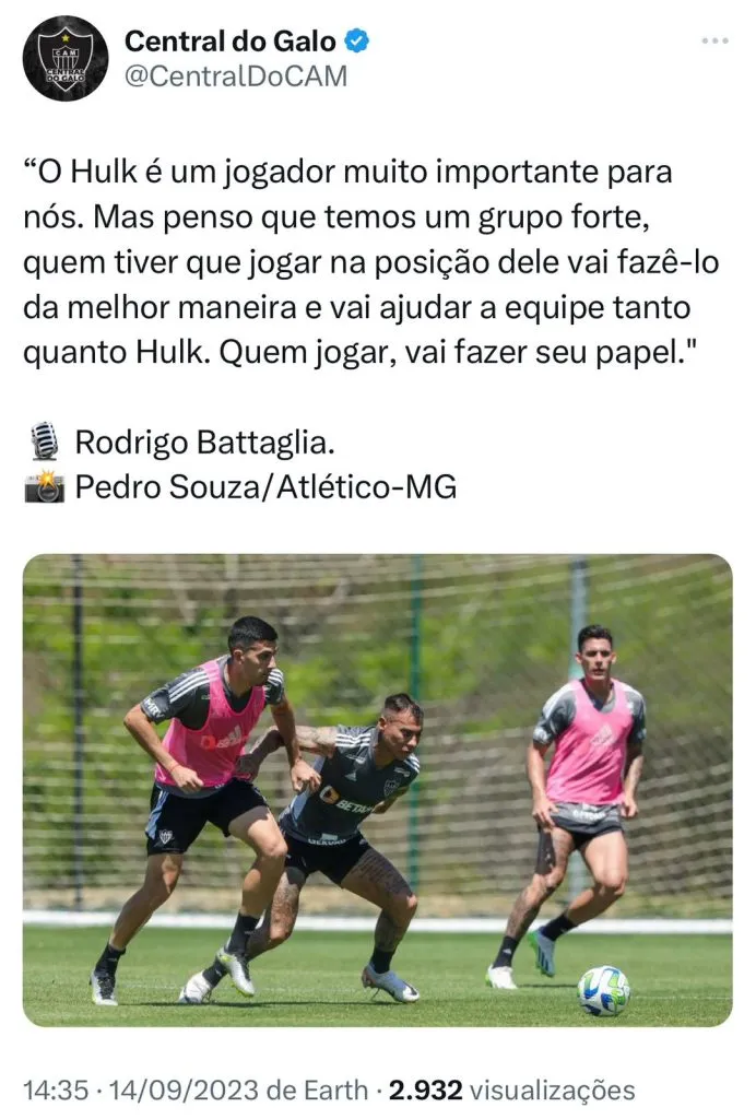 Por outro lado, o Atlético Mineiro não terá a presença de Hulk, que levou o terceiro cartão amarelo no último compromisso do Galo diante do Athletico Paranaense, na Arena da Baixada, e agora está inapto para atuar. Mesmo com a baixa do líder da equipe, o Galo tem condições de desempenhar um bom futebol. Na visão de Bataglia, o volante acredita que o Alvinegro pode vencer o líder do Brasileirão mesmo sem Hulk.