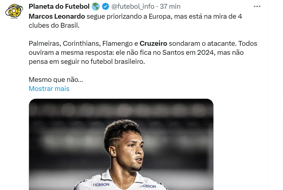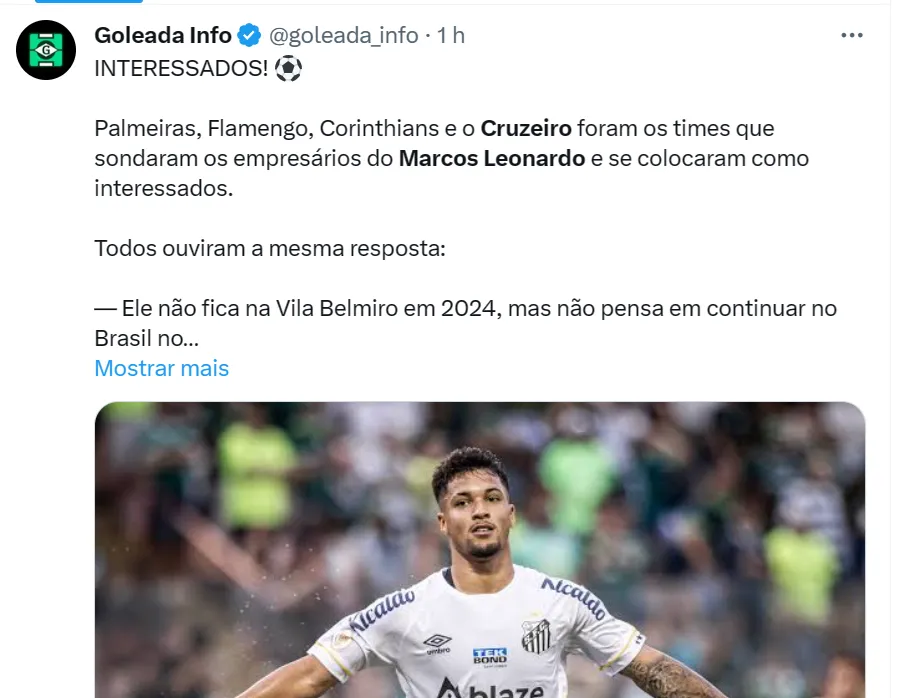 O empresário de ML foi categórico: “Ele não fica no Santos em 2024, mas não pensa em continuar no Brasil no momento”. O Benfica, de Portugal, está na frente para contratar o jogador.