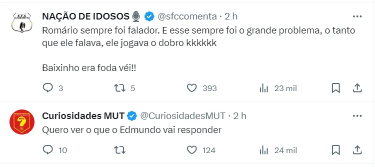 O ídolo Cruz-Maltino acabou sendo destacando de forma negativa nas redes por uma situação envolvendo Romário. O baixinho não poupou críticas ao rival ao analisar o desempenho no Mundial em 2000.