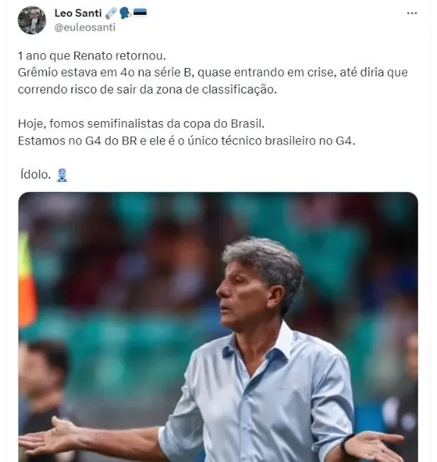 Mesmo em um ano em que, em tese, seria de reconstrução, como todo time que sobe, o Grêmio está brigando pelo título do Campeonato Brasileiro e deve ao menos, conseguir voltar para Libertadores em 2024. Tais resultados, fazem com que o perfil icônico e excêntrico do comandante, floresça novamente.