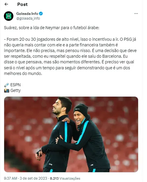 Falando em Suárez, o atacante gremista acabou dando uma entrevista para o Bola da Vez, da ESPN Brasil e lá acabou discorrendo sobre diversos assuntos. Entre eles, falou sobre a escolha de Neymar, com quem atuou na época de Barcelona, em ir para o Al-Hilal, da Arábia Saudita.
