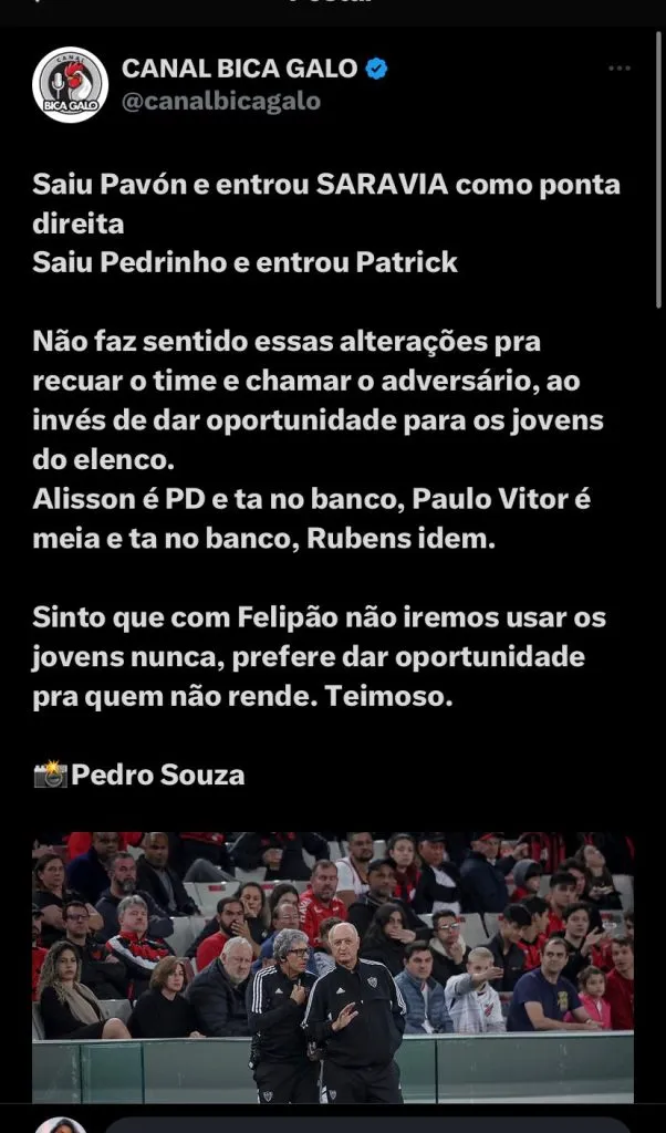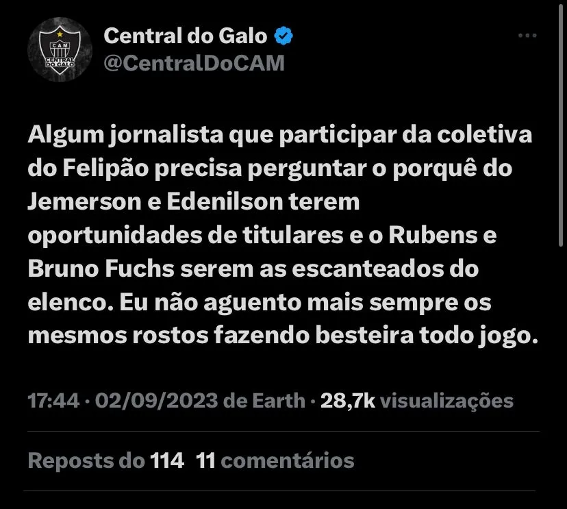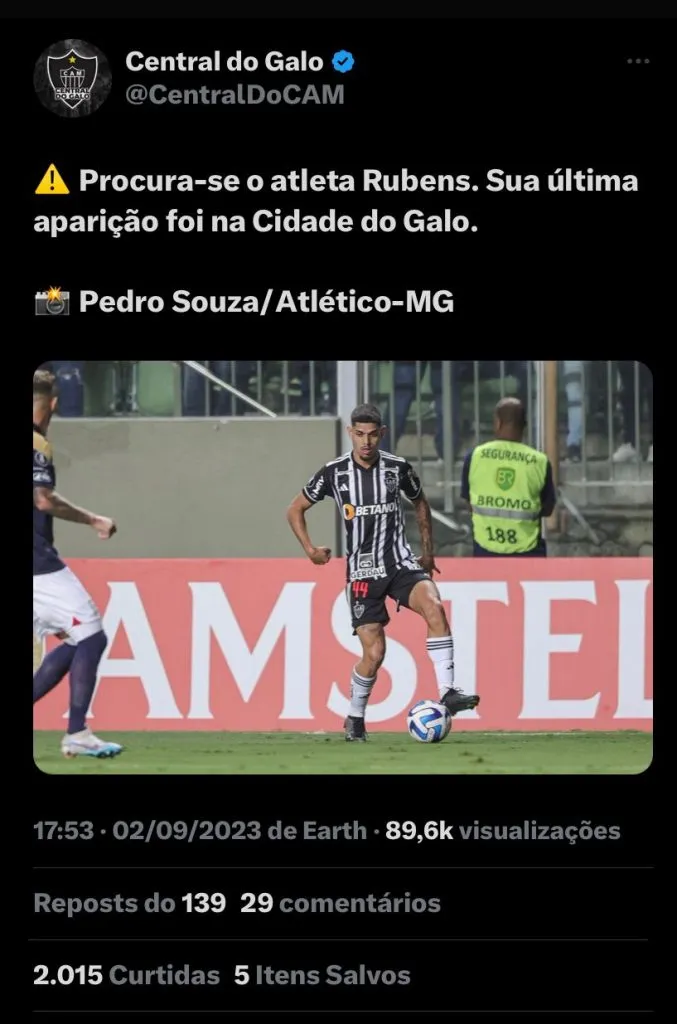 Nas redes sociais, os torcedores questionaram a não utilização do jogador: [SIC] “Algum jornalista que participar da coletiva do Felipão precisa perguntar o porquê do Jemerson e Edenilson terem oportunidades de titulares e o Rubens e Bruno Fuchs serem as escanteados do elenco. Eu não aguento mais sempre os mesmos rostos fazendo besteira todo jogo”, disse.