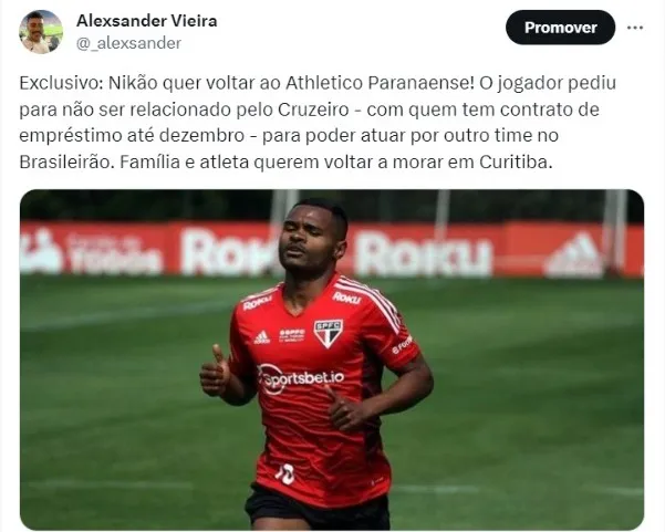 O São Paulo foi notificado sobre uma proposta do exterior pelo meia-atacante Nikão, na última janela de transferências. O clube entende ser uma proposta boa, mas o jogador e sua família estavam com pé atrás sobre a mudança de ares. O jogador está emprestado ao Cruzeiro e gostaria de voltar ao Athletico.