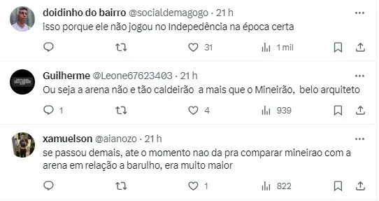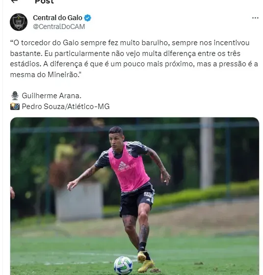 “O torcedor do Galo sempre fez muito barulho, sempre nos incentivou bastante. Eu particularmente não vejo muita diferença entre os três estádios. A diferença é que é um pouco mais próximo, mas a pressão é a mesma do Mineirão”, disse.