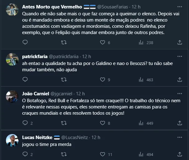 Para piorar, o clima envolvendo Renato Portaluppi e a direção gremista não vem bem há algum tempo. Desde quando o treinador “abandonou” a coletiva após o Gre-Nal, a torcida vem pegando no pé do ídolo e ele tenta se justificar. Ontem (21), ao ser questionado sobre o plantel do Grêmio, ele deu a seguinte resposta durante a coletiva realizada no Estádio do Morumbi: