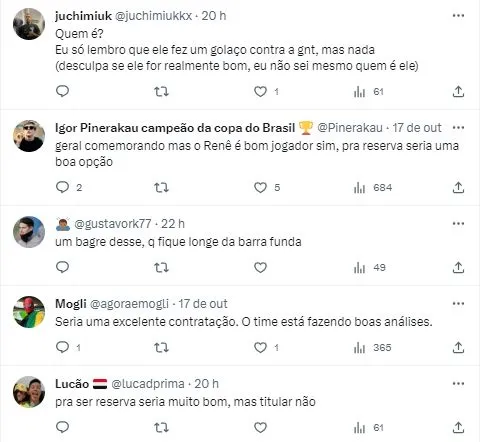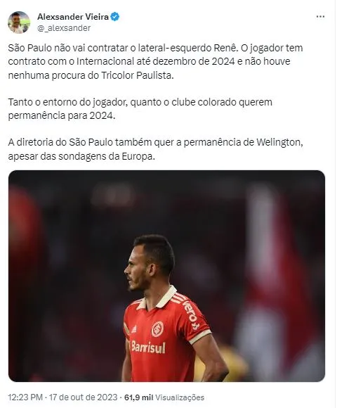 De acordo com Vieria, o São Paulo não tem nenhum interesse em contratar Renê, tanto, que a sondagem sobre tal possibilidade, sequer foi realizada. Isso porque o clube paulista pretende investir em Wellington, jovem da base que se destaca. Além disso, tanto o entorno do jogador, quanto o Colorado querem permanência para 2024, algo que foi cravado pelo jornalista Lucas Collar, quando a especulação começou a circular.