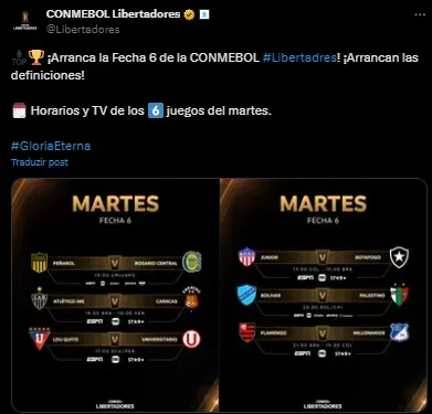 O Bolívar está na liderança, com 10 pontos. A equipe enfrenta o Palestino, jogando pelo empate para confirmar a ponta. Enquanto isso, o Flamengo enfrenta o já eliminado o Millonarios.