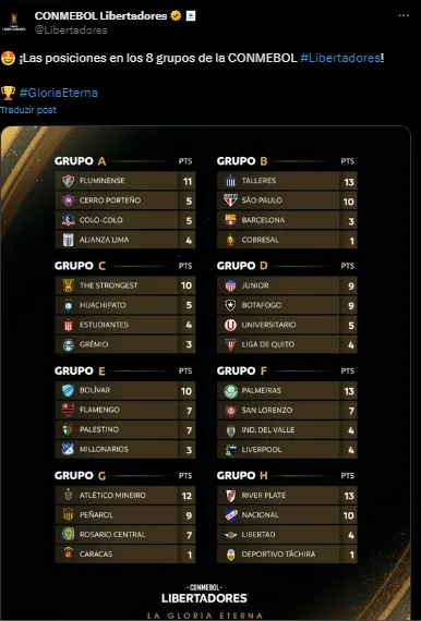 O Grêmio está na lanterna, ao mesmo que tem uma esperança na vaga das oitavas. As The Strongest é o líder, com 10 pontos. O Huachipato tem cinco, e o Estudiantes fica com quatro.