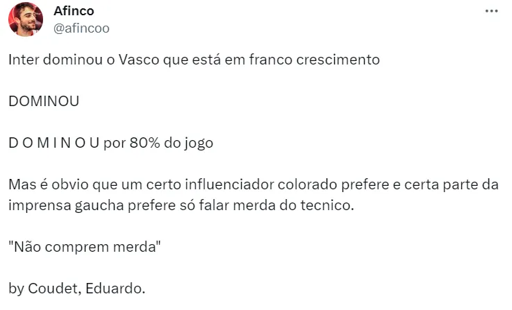 O treinador do Colorado falou ainda sobre a impaciência do torcedor, que definiu como compreensível. Porém, o argentino se mostrou confiante na recuperação do Cruz-Maltino. ”Nós compreendemos a impaciência da torcida, mas acho que o Vasco, como joga, desse jeito, não vai rebaixar. Essa é minha opinião pessoal”, concluiu Coudet.