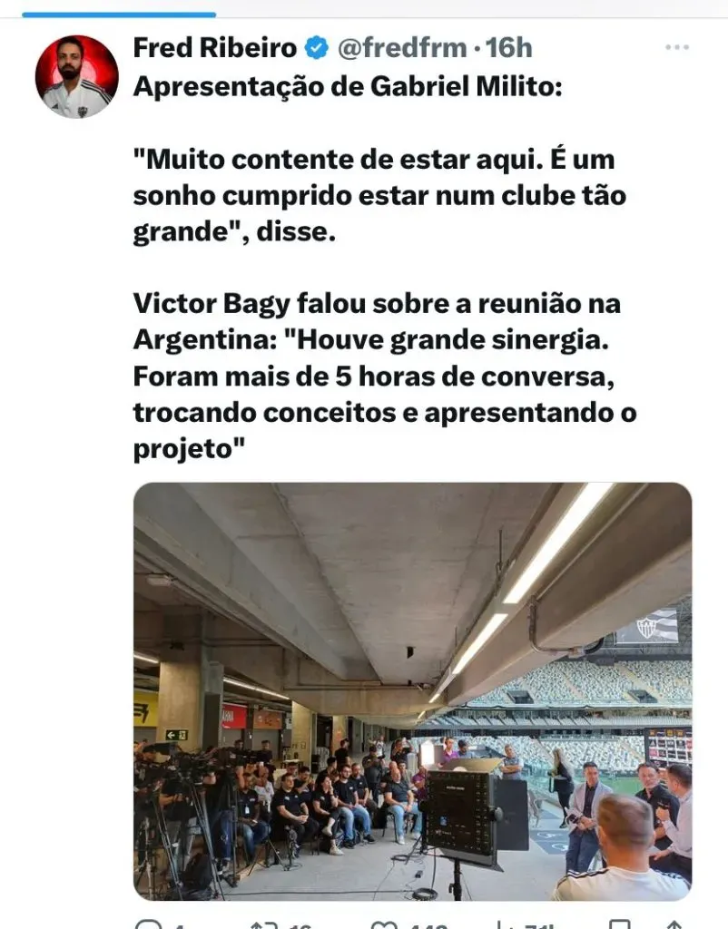De forma oficial, o Atlético Mineiro apresentou o seu novo treinador, Gabriel Milito, nesta quarta-feira (27), na Arena MRV. Ele que já está comandando a equipe mineira, agora oficialmente é conhecido pela torcida.