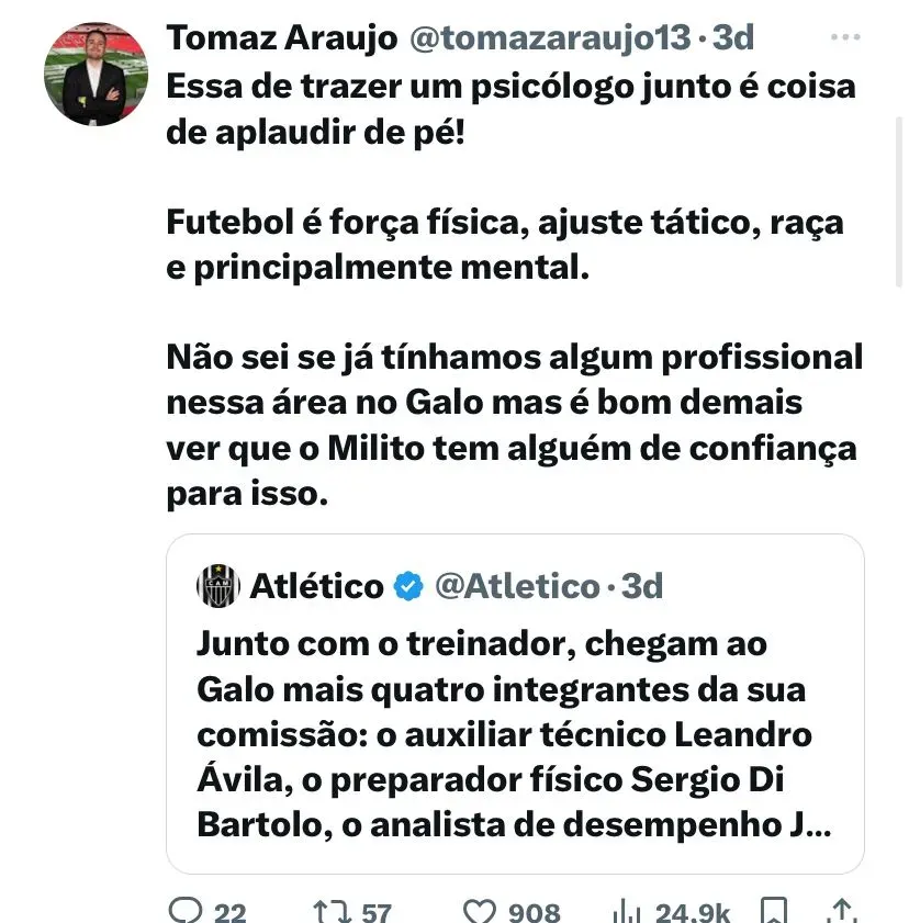 Em relação ao departamento de psicologia, o Galo já tem Michelle Rios, agora, Morales será mais um ajudando nessa comissão montada. Ele trabalha com o treinador argentino desde o Argentino Juniors, de 2021 a 2023.