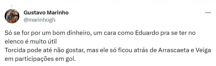 Assim como boa parte do elenco, Eduardo terminou a temporada em baixa. O contrato do camisa 33 é válido até o fim de 2024 e sua multa rescisória é avaliada em 30 milhões de euros (cerca de R$ 159 milhões).