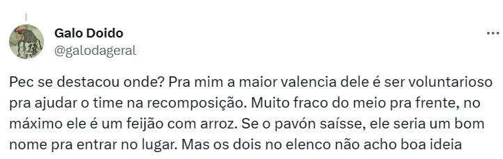 Segundo o jornalista Lucas Pedrosa, o Atlético demonstrou interesse em Gabriel Pec, do Vasco. Há conversas acontecendo nos bastidores, mas nenhuma proposta oficial foi apresentada pelo Galo ao time carioca.