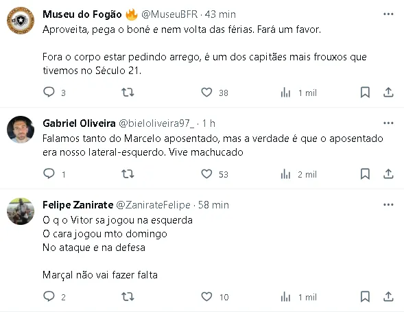 Apesar da evolução diária nos treinos, Marçal só deve retornar aos gramados em janeiro, coincidindo com o início do Campeonato Carioca, já que o elenco entrará em período de férias em 7 de janeiro.