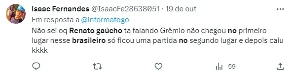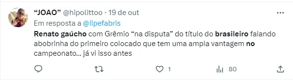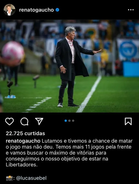 E quem parece já ter percebido também isso, é o técnico Renato Gaúcho. Após a derrota para o Athletico Paranaense, o comandante do Grêmio fez um post em suas redes sociais, deixando claro as reais intenções do imortal até o fim do Campeonato. O técnico que no mês de julho havia dito que “nosso maior objetivo é o Campeonato Brasileiro, brigar pelo título”, parece ter perdido o fôlego para perseguir o líder.