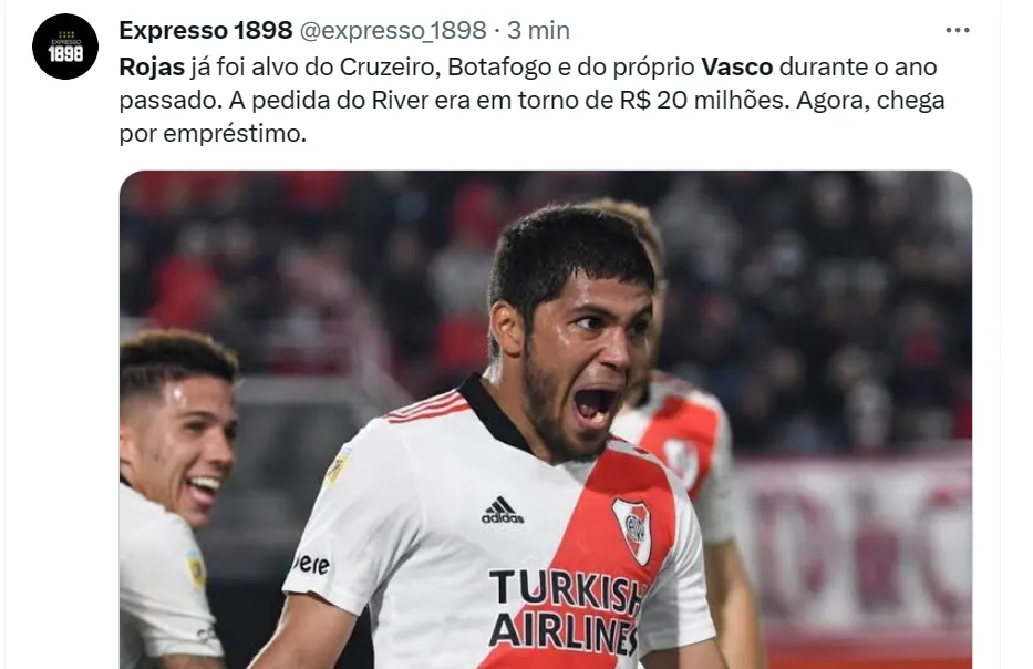 Rojas havia sido tentado pela SAF do Vasco em 2023, mas o clube de Buenos Aires não topou o negócio. O jogador de 27 anos estava cedido ao Tigre, mas o River aceitou a transferência ao Cruz-Maltino neste momento.