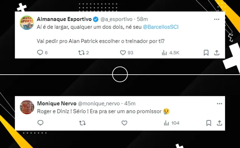 Os torcedores estão comentando sobre a possibilidade da vinda de Diniz ou Roger. Alguns torcedores são a favor da chegada do ex-treinador do Fluminense, e pedem sua vinda.