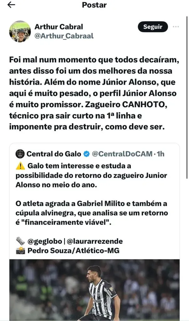 Em grande parte das últimas partidas, o atleta acompanhava o Galo. Além disso, um retorno também é aprovado pela torcida, que há algum tempo pede a contratação de mais um zagueiro.