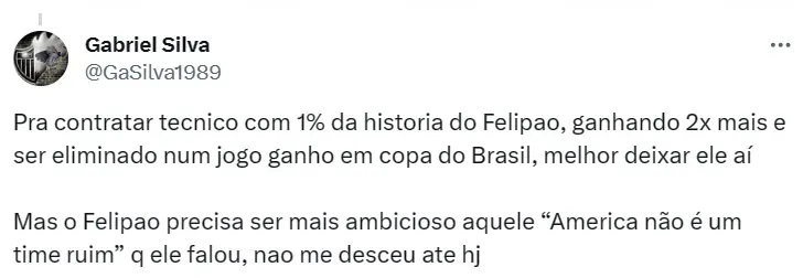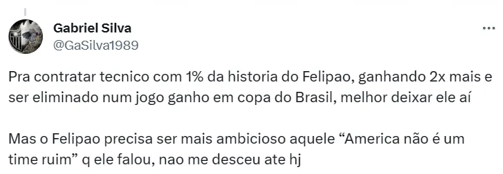 A diretoria já pensa como será o próximo ano e algumas definições estão em pauta. Como é o caso do próprio Felipão. O contrato do treinador com o Galo é válido até dezembro de 2024, mas há rumores sobre uma possível saída.
