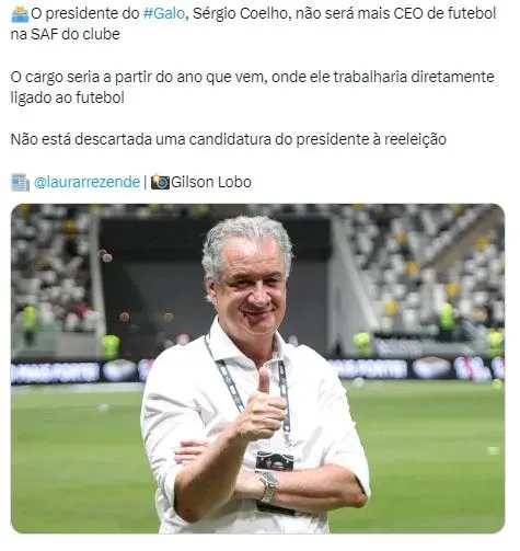 Isso porque, segundo apuração do portal Globo Esporte, Sérgio Coelho não vai mais assumir tal cargo, informação confirmada pelo próprio mandatário da Cidade do Galo. A desistência em desempenhar a função foi tomada por questões particulares.