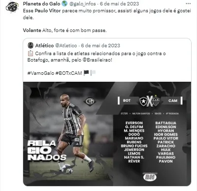 Quem não atua no torneio é o volante Paulo Vitor, de 19 anos, que foi promovido ao time principal do Galo por Eduardo Coudet, na temporada passada. Ele atuou no duelo contra o Cuiabá, ele jogou durante 16 minutos.