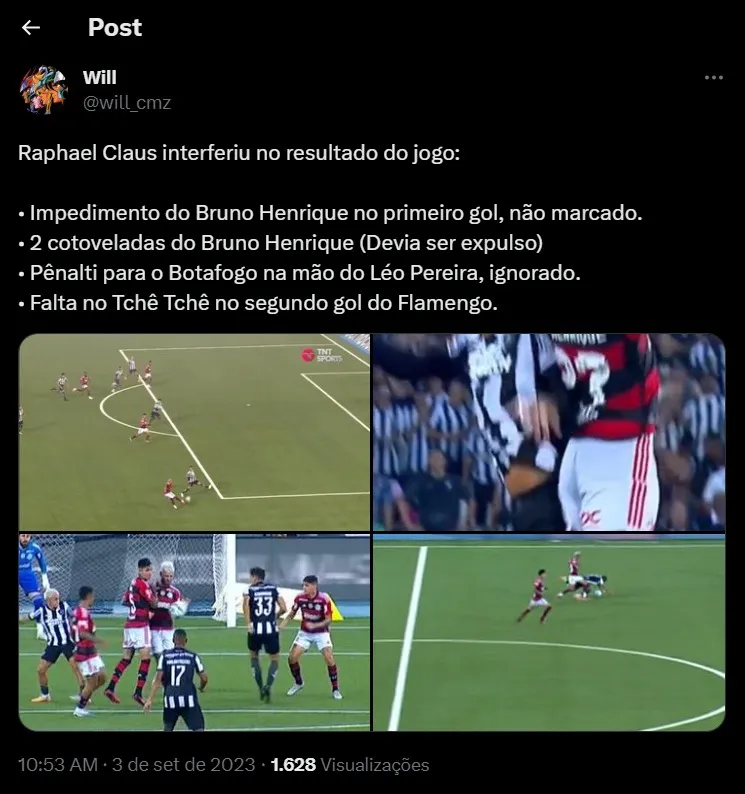 “No outro gol do Flamengo, há falta na roubada de bola que o Raphael Claus deveria marcar, mas o VAR não poderia interferir por não ser mais app”, completou. Apesar do resultado dentro de casa, foi uma boa rodada para o Alvinegro. Já que o segundo colocado empatou, mantendo assim uma ampla vantagem para a equipe no Brasileirão.