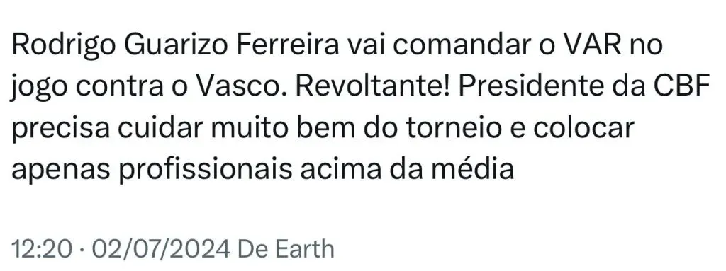 Os vascaínos alegam que ele já prejudicou o Clube em algumas decisões e, por isso, reclamam que a CBF poderia ter escolhido um outro profissional para ficar no VAR amanhã (3).