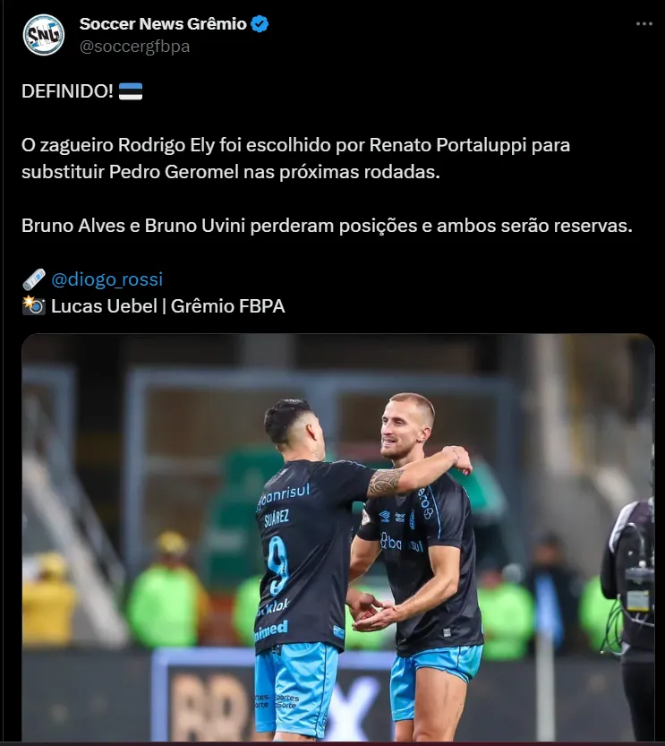 Conforme informações, o reforço do Imortal Rodrigo Ely furou a fila e ganhou a condição de titular. O atleta que construiu sua carreira no futebol europeu deixa a dupla Bruno Alves e Bruno Uvini para trás e assume a posição do eterno campeão da Libertadores no Rei de Copas.
