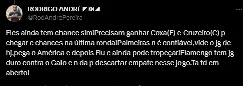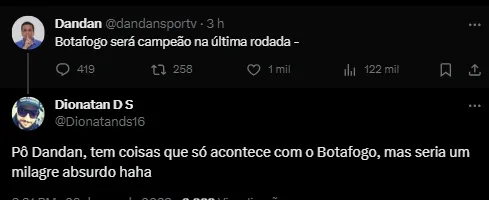 O narrador Daniel Pereira, do Grupo Globo, expressou sua opinião nas redes sociais, afirmando: “Botafogo será campeão na última rodada”.