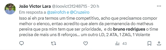 O jogador ainda disse que não definiu seu futuro para a próxima temporada: “Não tenho planos nada, não. Já deixei bem claro meu desejo para o clube, para todos que trabalham no clube, para os meus empresários. Primeira preferência claro que vai ser do Cruzeiro, estou muito feliz com o dever cumprido, e deixo isso para meus empresários”, afirmou.