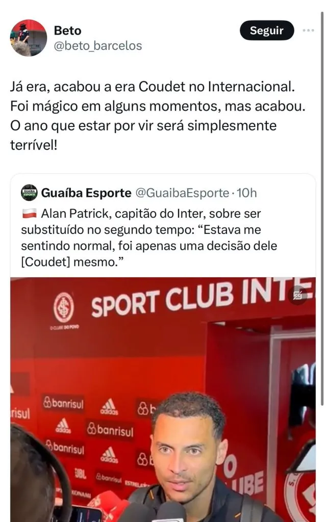 Coudet desabafa após tropeço do Internacional