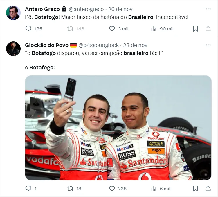 Assim, como, o Dailu Mail, da Inglaterra: “É essa a maior entregada da história do futebol? O clube brasileiro Botafogo estava 14 pontos no topo, porém venceu apenas dois dos últimos 15 jogos, incluindo uma sequência de colapsos nos minutos finais, e destruiu a liderança”.
