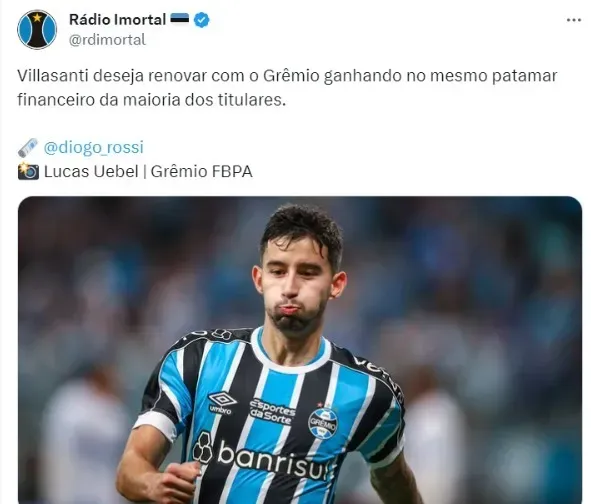 Antes, Diogo Rossi deu a informação de que Grêmio e Villasanti aceleram conversas para renovação de contrato e clima é de otimismo para final feliz em breve. Os dois lados estão mais flexíveis e dispostos ao acordo para contar com o volante em 2024. O salário de Villasanti deve chegar na mesma faixa salarial de Geromel e Kannemann.
