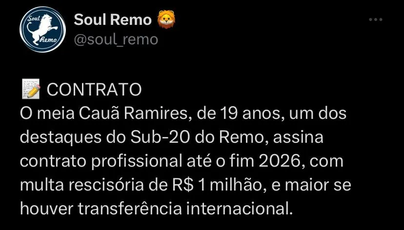 O Remo não tem mais calendário para o restante de 2023, mas a diretoria já começou a se mexer nos bastidores e investindo nas melhorias do seu elenco para 2024. Recentemente uma joia da base assinou um contrato com o profissional até 2026, o meia vinha se destacando no Sub-20 do Leão.