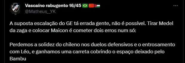Contra o CAP, pelo Campeonato Brasileiro, ainda no primeiro turno, o técnico colocou Medel de volante e acabou sendo um desastre, o chileno errou tudo, deixou espaços na defesa e fez até o momento sua pior atuação com a camisa do Clube Carioca. Esse é um dos motivos da raiva de alguns vascaínos, além do motivo de Maicon não ser nada confiável.