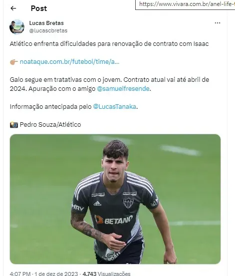 O atacante em questão é Isaac, de 19 anos, que é considerado um dos melhores atletas do time mineiro. As negociações se estendem há vários meses e o contrato dele é válido até abril de 2024.