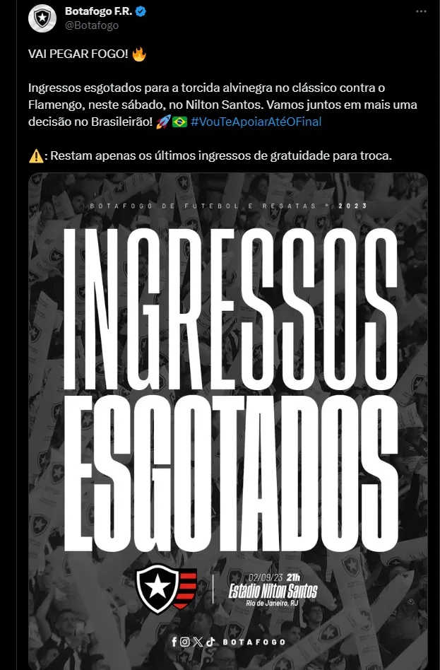 O Botafogo segue embalado, indo bem dentro e fora de campo e nesta quarta-feira (30) a torcida do Glorioso esgotou os ingressos para o jogo contra o Flamengo que será no próximo sábado (2) no estádio Nilton Santos.