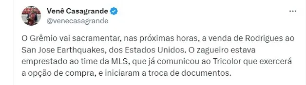 Segundo informações do jornalista Venê Casagrande, o Grêmio vai sacramentar, nas próximas horas, a venda de Rodrigues ao San Jose Earthquakes, dos Estados Unidos.