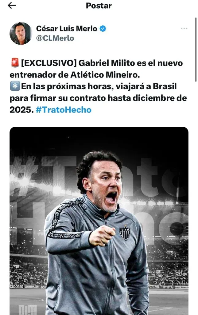 É oficial, o argentino Gabriel Milito é o novo treinador do Clube Atlético Mineiro. Foi confirmado agora há pouco neste sábado (23), através do jornalista argentino especializado em mercado César Luis Merlo.