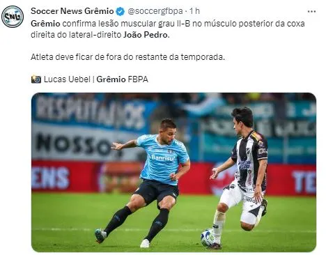 O risco de ficar fora da reta final do Brasileirão é grande, pois o tempo estimado para a volta de João Pedro ultrapassa a tabela de jogos. Para se ter uma ideia, a última partida do Grêmio acontece no dia 6 de dezembro, contra o Fluminense, ou seja, em menos de um mês.
