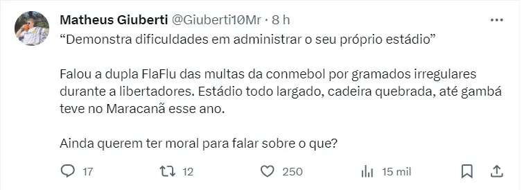 “A conduta adotada pelo Vasco da Gama demonstra que seu discurso durante os últimos meses tinha por objetivo, apenas, tumultuar. (…) A postura do Vasco da Gama demonstra que não pretende um ‘Maracanã de todos’, mas sim, um ‘Maracanã de ninguém’”, detalha um trecho da nota.