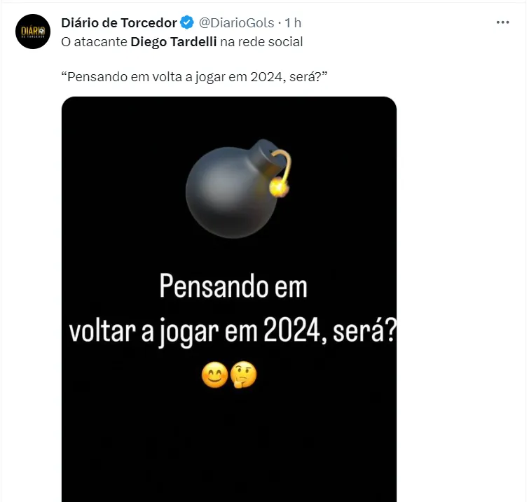 Isso porque, através das redes sociais, Diego Tardelli publicou sobre o desejo de voltar aos gramados na próxima temporada. Vale destacar que o atacante não atua profissionalmente desde 2021, mas ainda assim, indicou o desejo de retornar à função.