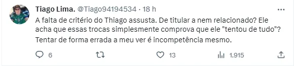 Olha a data e tem jogador estreando, essa SAF é um puro SUCO DE AMADORISMO“, “Da até medo de ter um cara como o Marco na zaga. Será que está com o condicionamento físico bom?” , “Thiago e seus critérios de m*. Pelo provável time que vi hoje, será outra noite tenebrosa. Thiago precisa CAIR urgente e o CLUBE precisa planeja ano que vem! Mas isso é PRA ONTEM. Antes que eu esqueça: Fora Athur Moraes”, “Problema é que o time dentro de campo é todo desajustado. Parece que o time não treina”, “Que bagunça esse Coritiba!”, Elenco mal montado queima atleta bom” , “Kosloski está PERDIDO!”, “Isso é muito Coritiba. De titular a nem banco e de nem banco pra titular. No próximo jogo um terceiro será o titular e bagunça que segue”, publicaram alguns torcedores no Twitter.