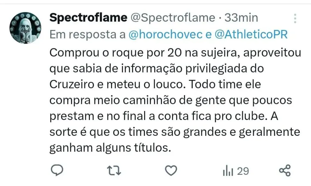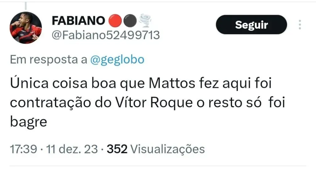 “Mattos está indo embora porque o Petraglia cortou a lambança de compra de tiriças que não dão nenhum resultado fora comissão pra empresário…. Já vai tarde.”, escreveu um torcedor no ‘X’, antigo Twitter.