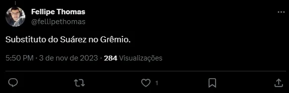 “Substituto do Suárez no Grêmio”, “Grêmio, substituto do Suárez aí”, “Olha aí o substituto do Suárez livre no mercado” e “Temos o substituto de Suárez pro ataque”, foram alguns dos comentários.