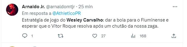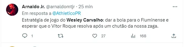 É bom informar que, o Rubro-Negro Paranaense atuou com dez jogadores desde os 22 minutos do primeiro tempo, quando o lateral-esquerdo Vinícius Kauê acabou expulso. Ainda assim, muitos torcedores perderam a paciência com o treinador Wesley Carvalho. Pelo Twitter, alguns fizeram questão de demonstrar seu descontentamento: “Wesley Carvalho é burro demais. Com ele, vaga direta só se for pra série B”, disse um torcedor.