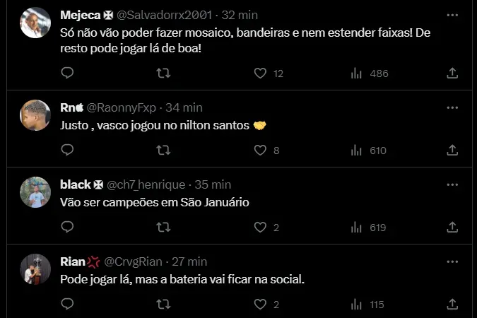 Ele vai além e acrescenta que SJ está na pauta do dono do Bota: “Sendo assim, São Januário surge como opção para receber o duelo, mesmo que não seja o plano A do Botafogo. O Maracanã é considerado a primeira opção dos alvinegros cariocas, mas a Colina Histórica está no radar de John Textor”, acrescentou.