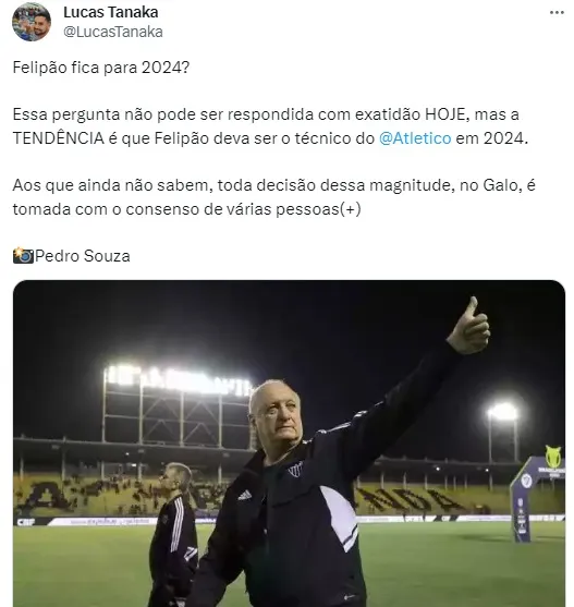 Segundo a informação, é provável que de fato Felipão permaneça em 2024 no comando do Galo. Apesar de não ser 100% certo, é alto esperado.