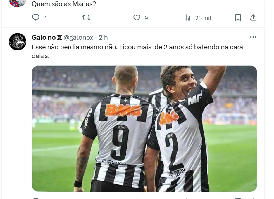 “Está doido, não tem jeito. Não perco para as ‘Marias’ não. Você está doido”, tirou onda Marcos Rocha em tom de provocação ao rival Cruzeiro, que poderia (na teoria) ajudar o Atlético na tabela.
