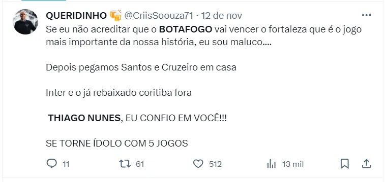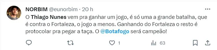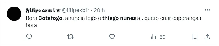 De acordo com informações do Canal do TF, o sócio majoritário do Alvinegro não participará da apresentação do técnico Thiago Nunes, que ainda não foi marcada. Vale destacar que essa proibição foi estendida para o CT do Espaço Lonier, impedindo a presença do mandatário.